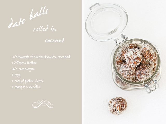 Date balls are simple to make and require no baking. For those of you who haven’t eaten dates before, or are not mad about the idea of eating them, I can assure you that these delightfully sweet balls of boiled dates, butter, sugar, and biscuit encased in coconut, are little tastes of heaven.