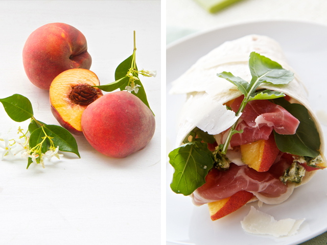This combination of wafer thin ham, pecorino cheese, juicy ripe peaches and fresh rocket leaves in a soft wrap is the perfect blend for a fresh and easy lunchtime meal.