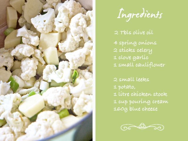 - Heat the oil and fry chopped spring onion, celery, garlic, cauliflower, leeks and potato for 2 minutes.